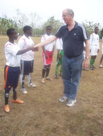 Stuart made his fourth visit to Togo in January 2012. As usual a major purpose was to work with Aimé and the Amis du Monde girls football team, which Verité Sport has supported for three years. Stuart saw the team play and draw 0-0. A surreal aspect of the game was to see two teams line up in England kit – one in blue and one in white – supplied by the FA.What was really encouraging was that the team was very young. As the original team has grown through the teens and is entering their 20s, Aimé has started again with girls who are 14-15, with some of the originals now helping run the team.