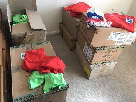 Again this year the Football Association offered us some of their surplus kit. We received over 30 boxes containing about 1500 items of kit. In addition two of our partners collected additional kit direct from the FA. The first step is sorting and packing ready for dispatch.